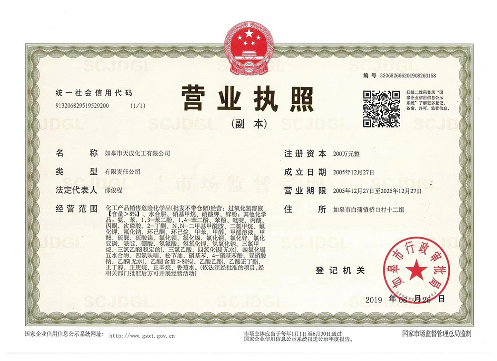 ? 如皋市天成化工有限公司創(chuàng)建于1996年。公司地處于美麗富饒的長江三角洲,座落在古鎮(zhèn)林梓,通揚運河河畔。南瀕長江、西臨204國道,距南通港、飛機場30公里,立體交通發(fā)達。公司經(jīng)營管理規(guī)范,技術力量雄厚,擁有一批高、中級專業(yè)技術人才。